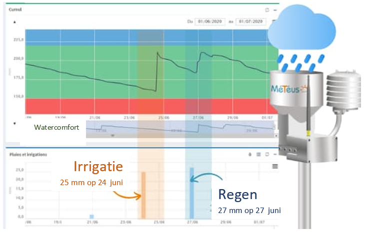 Dit geeft u alle informatie die u nodig hebt om uw irrigatie op het juiste moment te starten of te stoppen en te zorgen voor het nodige watercomfort voor de groei van uw gewassen.